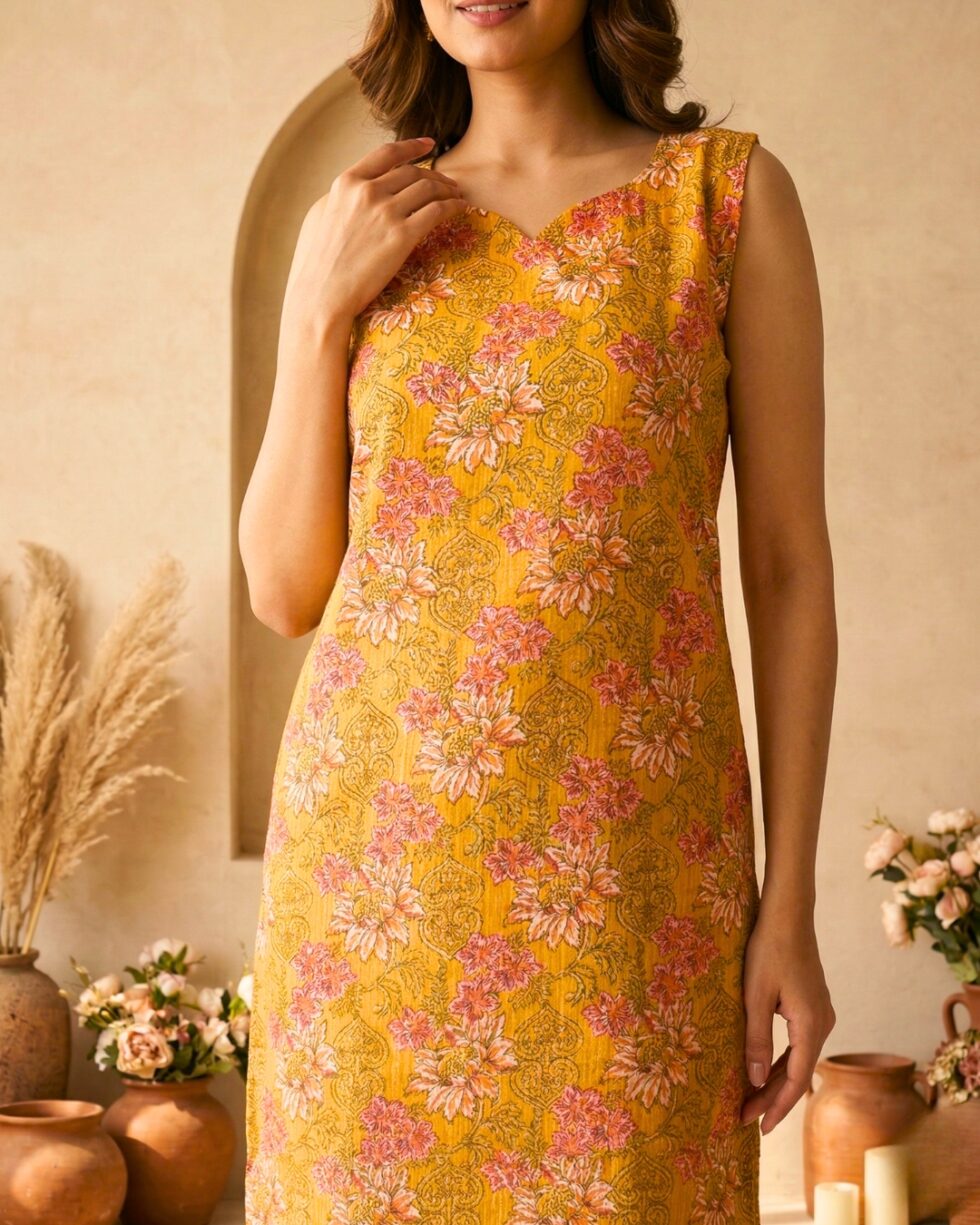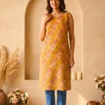Be the first to review “Mustard & Ivory Floral Printed Sleeveless Straight Kurti for Women”