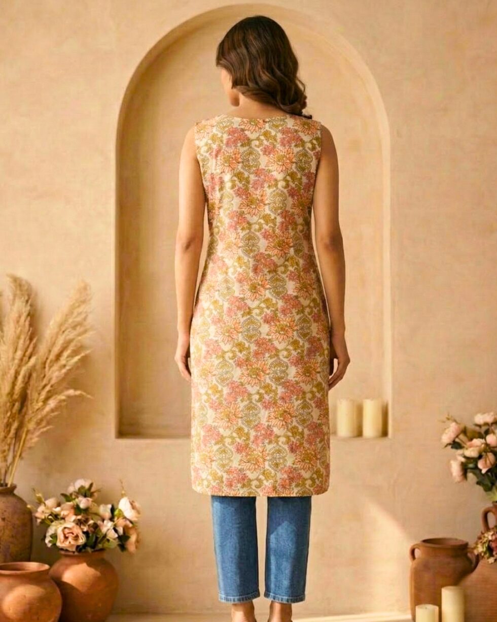 Add a fresh and stylish touch to your everyday ethnic wear with this beautiful floral printed sleeveless kurti for women. Designed with an elegant all-over floral print pattern, this kurti gives a modern yet traditional look that is perfect for daily wear.