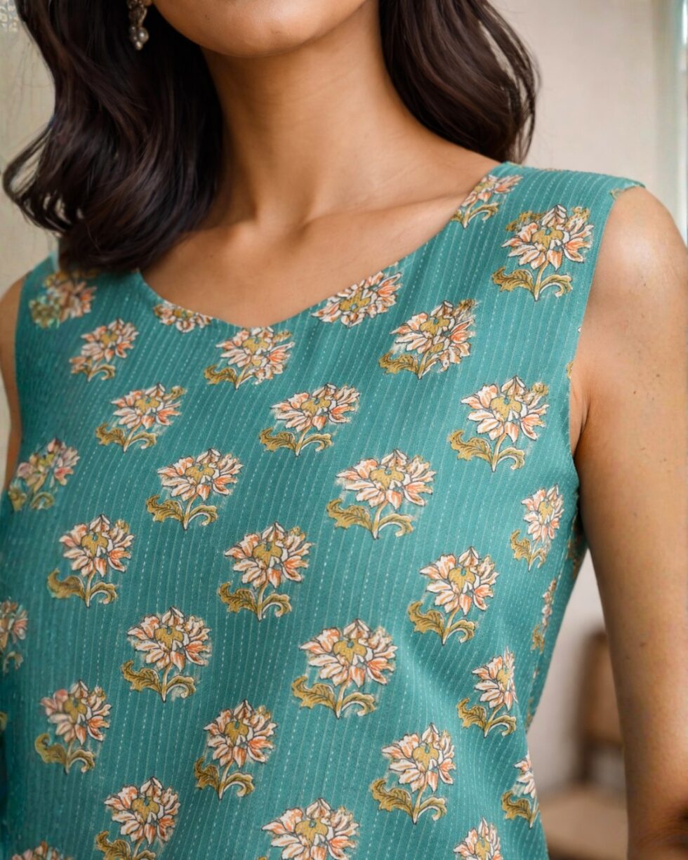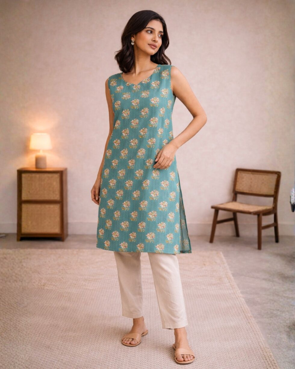Refresh your everyday ethnic style with this beautiful teal floral printed sleeveless kurti for women. Designed with a simple yet elegant look, this kurti features an all-over floral print pattern that adds a fresh and stylish touch to your outfit.
