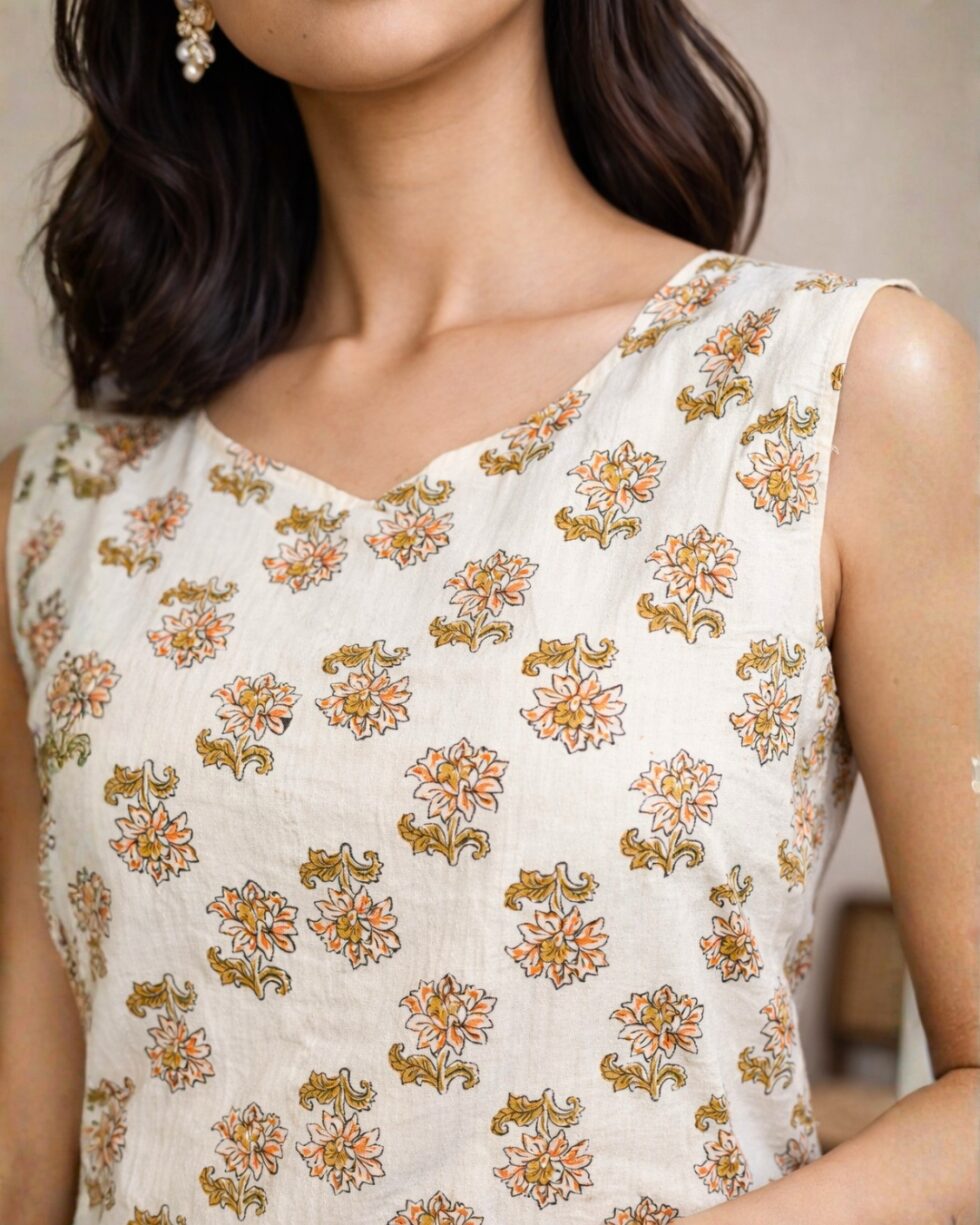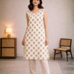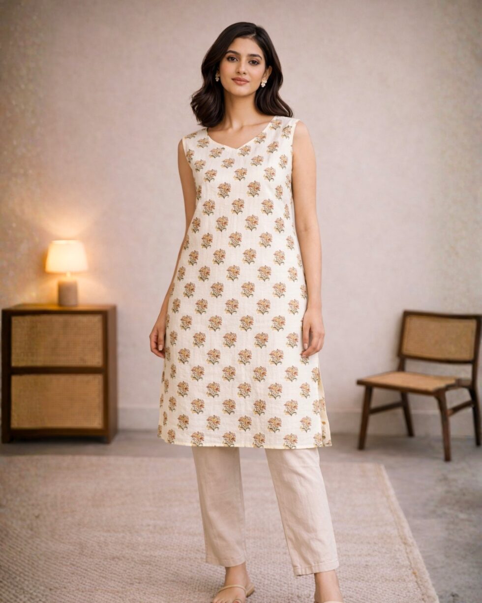 The delicate floral block print pattern gives the kurti a traditional yet trendy feel, making it a great choice for women who like comfortable and stylish ethnic wear.